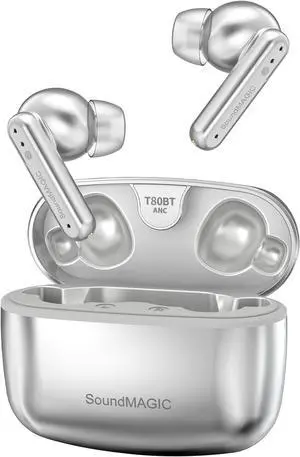 SoundMAGIC T80BT ANC True Wireless Earbuds with Hi-Res Audio,Hibrid Active Noise Cancelling, ENC Call Clarity, 20H Playtime, IPX5 Waterproof, Ultra-Comfy Fit for Sports/Work/Gaming Sliver