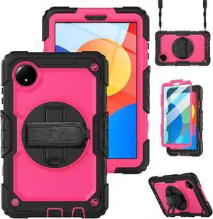 BONAEVER Case for Xiaomi Redmi Pad SE 8.7 inch 2024, Shockproof Cover with Built-in Screen Protector 360 Rotate Stand Hand Strap Shoulder Strap Pencil Holder Rose Red