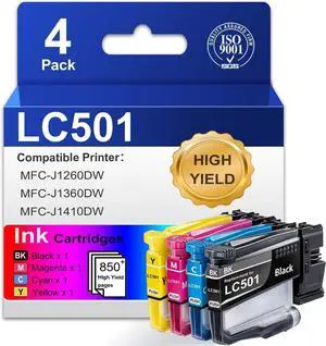 LC501 Ink Cartridges High Yield Compatible LC 501 XL for Brother MFC-J1260DW, MFC-J1360DW, MFC-J1410DW Printer 501XL Ink Cartridges(Black, Cyan, Magenta, Yellow, 4 Pack)