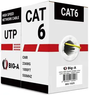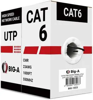 Big-A - 1000ft Cat6 Ethernet Cable, 23AWG Solid 4 Pair, Cat 6 UTP, 550MHz, Black, Compatible with VoIP Phones, IP Cameras, Gaming Consoles, Ethernet Extenders, Switch Boxes, PoE Devices, Routers
