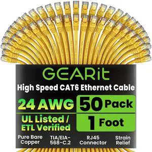GEARit Cat 6 Ethernet Cable (50-Pack 1 Foot) Cat6 Network Patch, 10Gbps, RJ45, Snagless Cord, Gold-Plated Connectors, Internet for PC, TV, Tablet, Router, Printer, Servers, IT Data Center - Yellow