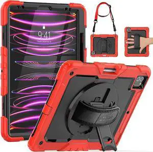 iPad Pro 12.9 Case 6th/ 5th/ 4th/ 3rd Generation, Heavy Duty Protection Shockproof Case with Screen Protector, 360° Rotating Stand/Handle/Shoulder Strap, Support Pencil 2 Charging, Red