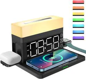 6 in 1 Wireless Charger,6 in 1 Wireless Charging Station with Digital Alarm Clock,Clock,Colorful Atmosphere Night Light,15W Fast Charger Compatible with iPhone 14/13/12/11/XS/8 Samsung Galaxy AirPods