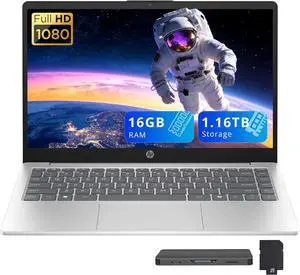 HP 14" FHD Anti-Glare Laptop, Intel Core i5-1334U, 16GB RAM, 1.16TB Storage (1TB SSD+160GB Docking Station Set), Intel Iris Xe Graphics, Full Size Keyboard, 720p Camera, Win 11, Silver