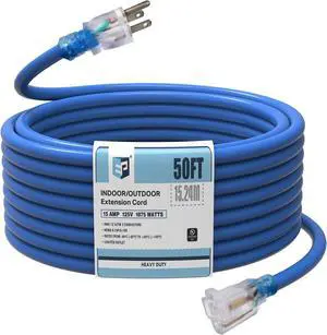 EP 50Ft Outdoor Extension Cord, 12/3 SJTW Heavy Duty Waterproof Power Cable, 3 Prong Grounded Plug, Lighted End, for Lawn, Garden, Appliances, Blue