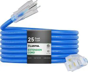25Ft 12 Gauge Outdoor Extension Cord with 3-Outlets, Heavy Duty 12/3 Extension Cord with Lighted end, 15A 12AWG 1875W SJTW, ETL Listed - Great for Garage, Garden and Home, Black