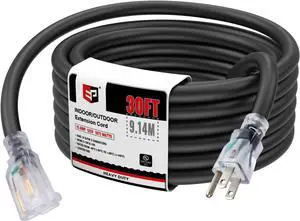 EP 30 Ft Lighted Outdoor Extension Cord - 10/3 SJTW Heavy Duty Black Extension Cable with 3 Prong Grounded Plug for Safety, UL Listed