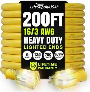 Lighted Indoor Outdoor 25 FT Extension Cord with 3 Electrical Power Outlets - 12/3 SJTW Heavy Duty Yellow Extension Cable with 3 Prong Grounded Plug for Safety, UL Listed