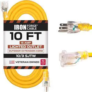 Iron Forge Cable 10 Gauge Heavy Duty Extension Cord 10 ft - SJTW Lighted Outdoor Extension Cable Yellow 3 Prong Grounded Plug 15 AMP, Great for Major Appliances & Space Heater - UL Certified