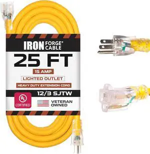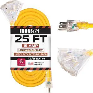 IRON FORGE CABLE 25 Foot Lighted Outdoor Extension Cord with 3 Electrical Power Outlets - 12/3 SJTW Heavy Duty Yellow Extension Cable with 3 Prong Grounded Plug for Safety, 15 AMP