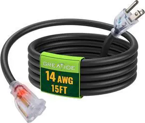 15 Ft 14/3 Lighted Outdoor Extension Cord - 14 Gauge SJTW Heavy Duty Black Extension Cable with 3 Prong Grounded Plug, Great for Lawn, Garden, Appliances