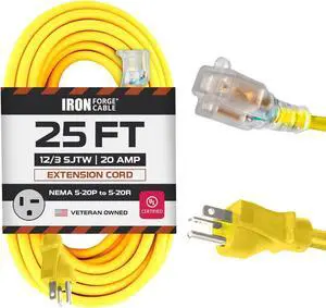 Iron Forge Cable 25 Ft Extension Cord - Nema 5-20 Extension Cord, 5-20P to 5-20R Lighted Yellow SJTW 12 Gauge Electric Cable, 20 Amp Heavy Duty - Great for Power Tools, Space Heaters