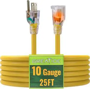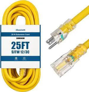 25 Ft Lighted Outdoor Extension Cord - 10/3 SJTW Heavy Duty Yellow Extension Cable with 3 Prong Grounded Plug for Safety, UL Listed