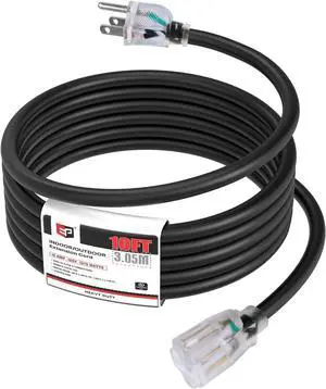 EP 10Ft 14/3 Lighted Outdoor Extension Cord - 14 Gauge 3 Prong SJTW Heavy Duty Black Extension Cable with 3 Prong Grounded Plug for Safety,Great for Garden and Major Appliances,UL Listed