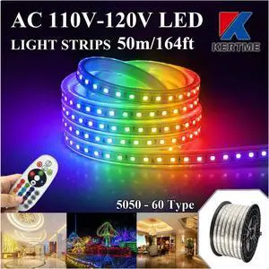 5050-60 Type AC 110-120V RGB LED Strip Lights, Flexible/Waterproof/Dimmable/Multi-Colors/Multi-Modes LED Rope Light + 24 Keys Remote for Home/Garden/Building Decoration (164ft/50m, RGB)
