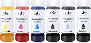 L&C sublimation ink for epson 8550 8500 Wide-Format Supertank Printers Heat Press Transfer on T-Shirt Tumblers Auto-Fill ICC-Free 6 Colors