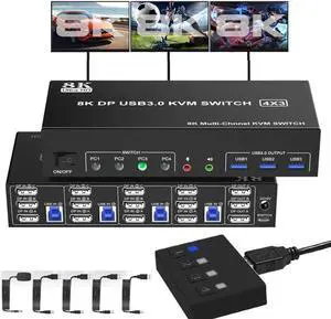 8K Displayport USB 3.0 KVM Switch 3 Monitors 2 Computers, DP1.4 Triple Monitor Displayport KVM Switch with 4 USB 3.0 Ports, 8K@60Hz 4K@144Hz DP KVM Triple Monitor Keyboard Mouse Switcher