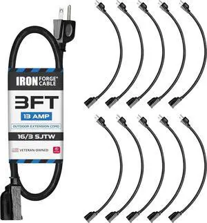 IRON FORGE CABLE 10 Pack Short Extension Cord 3 Feet, 16/3 Black Extension Cord, 3 Prong, Weatherproof, Small Plugs for Wall Outlets & Power Strips Great for Office & Household Appliances