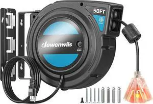 DEWENWILS Retractable Extension Cord Reel, 60FT Retractable Cord Reel, 12AWG/3C SJTOW, Lighted Triple Tap Outlets, 15A Circuit Breaker, Wall/Ceiling Mounted Heavy Duty Power Cord