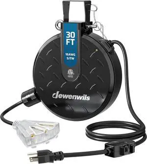 DEWENWILS 30FT Retractable Extension Cord Reel, Ceiling/Wall Mount 16/3 SJTW Power Cord with 3 Outlets Lighted Triple Outlets for Garage Shop, 10 Amp Circuit Breaker, Metal Plate, ETL Listed, Black