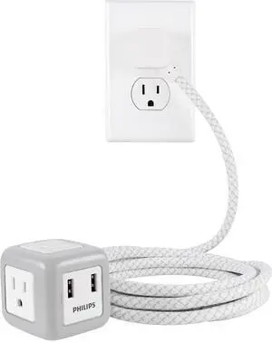 Philips 10 Ft Cube Extension Cord - 3-Outlet Flat Plug with 2 USB Ports, Gray/White, SPS3102WB/37