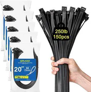 20Inch Heavy Duty Black Zip Ties with 250lbs Tensile Strength, Long Durable Nylon Zip Cable Ties UV Resistant Plastic Wire Ties Self-Locking Tie Wraps Perfect for Home Garden Office Workshop (150Pack)
