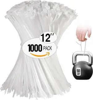 White Zip Ties 12 Inch 1000 Pack Clear Tensile Strength 50 lbs UV Resistant Industrial Cable Ties Self Locking Zipties Wire Ties Wrap Indoor Outdoor Use for Fence Garage Camping