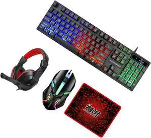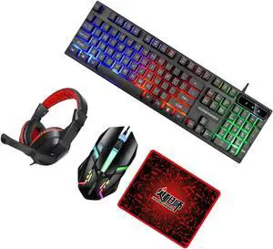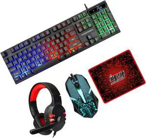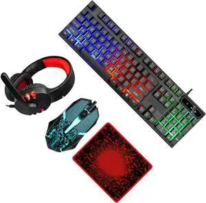 Wired Gaming Keyboard and Mouse Headset Combo,Rainbow LED Backlit Wired Keyboard,Over Ear Headphone with Mic,Rainbow Backlit Gaming Mice,Mouse Pad,for PC,Laptop,Mac,PS4,Xbox(Black)