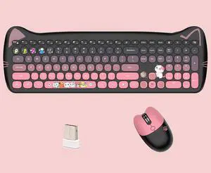 Cute Cat 2.4G USB Wireless Keyboard and Mouse Combo, Silent Keys, Candy Colors, Compatible with Notebook, PC (BlackPink-110keys)