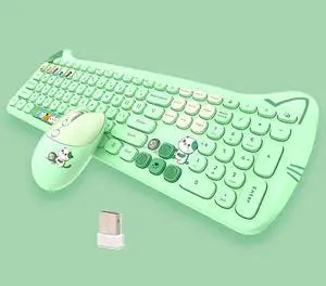 Cute Cat 2.4G USB Wireless Keyboard and Mouse Combo, Silent Keys, Candy Colors, Compatible with Notebook, PC (Green-110Keys)