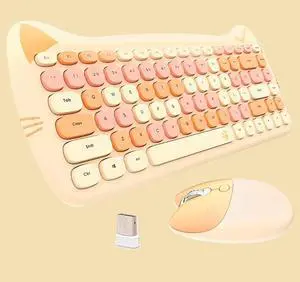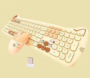 Cute Cat 2.4G USB Wireless Keyboard and Mouse Combo, Silent Keys, Candy Colors, Compatible with Notebook, PC (MilkTea-110Keys)