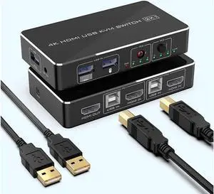 KVM Switch HDMI 2 Port Box Rocketek 2 USB 2.0 Hub Share 2 Computers to One HD Monitor 4K@30Hz KVM Switcher Adapter USB Switch Support Wireless Keyboard and Mouse Connections with 2 USB Cable