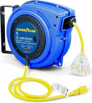 Goodyear Extension Cord Reel 14AWG x 40 Feet 3C SJTOW Triple Tap Connector Heavy Duty Slow Retraction Stop at Any Point