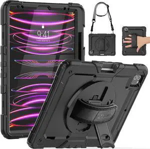 iPad Pro 12.9 Case 2022/2021/ 2020/2018, Heavy Duty Protection Shockproof Case with Screen Protector, 360° Rotating Stand/Handle/Shoulder Strap, Supports Pencil 2 Charging, Black