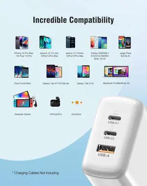 USB C Charger Block, 65W 3 Port QC + PD3.0 GaN Power Adapter Type C Fast Charging Block Wall Plug for Mac-Book Pro/Air, i-Pad Pro, i-P-hone 15 Pro Max/14/13/12, Android Phones etc.. (White)