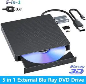 AUTYUE 5 in 1 External Blu ray Drive, Multifunctional USB 3.0 Type-C 3D External Blu-ray Slim Optical Drive CD DVD Drive Burner with SD/TF Card Reader/2 USB 3.0 Hubs for Windows XP/7/8/10/11, MacOS
