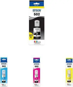 Epson 502 EcoTank Auto-Stop Ink Bottle, Black (T502120) with Cyan, Yellow, & Magenta