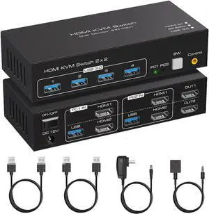 2x2 HDMI KVM Switch Matrix, 4K Dual Monitor HDMI KVM Switch Extended Display USB KVM Switch 2 in 2 Out for 2 Computers 2 Monitors with 3.5mm Audio, Support 4 USB 3.0 Share Keyboard Mouse with Hotkey