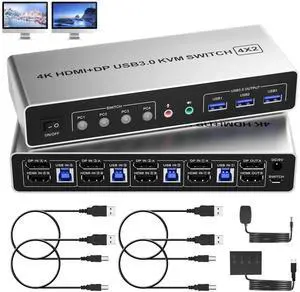 Displayport + HDMI KVM Switch 2 Monitors 4 Computers - 4K@60Hz Dual Monitor KVM Switch for 4 Computers Share 2 Monitors & 3 USB 3.0 Ports/Audio/Mic, HDMI DP KVM Switches for 4 PC 3 USB Devices
