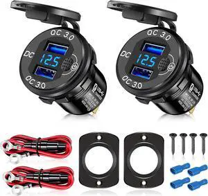 [Upgraded] 2Pcs 12V/24V USB Outlet with Voltmeter& ON/Off Switch, Quick Charge 3.0 Dual USB Power Outlet, Waterproof Fast Charge USB Charger Socket DIY Kit for Car Boat Marine (2 Pack)