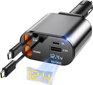 Gwydre Retractable Car Charger, 4 in 1 Fast Car Phone Charger 60W, Retractable Cables and USB Car Charger,Compatible with iPhone 15/14/13/12/11,Galaxy (Round)