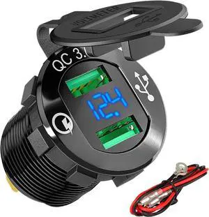 DAIERTEK Quick Charge 3.0 USB Charger Socket Car Aluminum Waterproof Dual Power Outlet Fast Charger with Blue LED Voltmeter & Wire 10A Fuse for 12VDC/24VDC Automotive Boat Marine ATV Truck