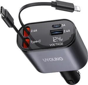 Retractable Car Charger 4 in 1 Fast Car Phone Charger Adapter,Double Type C Retractable Cables and 2 USB Ports Car Charger Compatible with iPhone 16/15/14/13/12/11 Pro max, Galaxy, Google Pixel