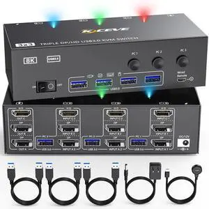 KVM Switch 3 Monitors 3 Computers, 4K@144Hz HDMI+2 Displayport KVM Swticher Support 8K@30Hz, 3 PC Triple Monitor KVM Switches, Support Extended Mode