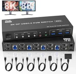 4 Port 8K Displayport USB 3.0 KVM Switch 2 Monitors for 4 Computers 2 Monitors, DP1.4 Display Port KVM Switch with Audio Microphone Output and 3 USB 3.0 Port, 8K DP Monitor Switch for 4 PCs 2 Monitors