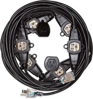 Iron Forge Cable 50 ft Heavy Duty Extension Cord with 7 Evenly Spaced Power Outlets, 14/3 Weatherproof Outdoor Extension Cord with Multiple Outlets for Outside, 15 AMP Black