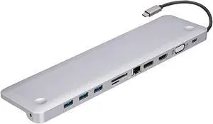 Amazon Basics Aluminum Type-C Docking with DisplayPort, HDMI, VGA, 3 USB-A, Ethernet, SD/TF Card Reader, Audio, and Type-C Charging Port (PD 100W) - Pedestal, Silver