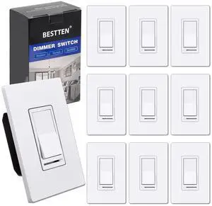 [10 Pack] BESTTEN 3 Way or Single Pole Dimmer Light Switch for Incandescent or Halogen Bulbs, CFL and LED Dimmable Lamps, Screwless Wallplate Included, cUL Listed
