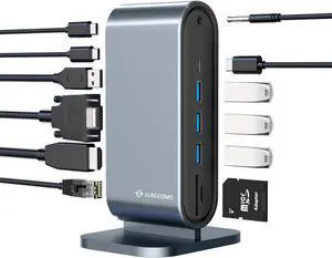 13-in-1 Triple Display USB C Docking Station with Dual 4K HDMI, VGA, Four USB Ports, an SD/TF Card Reader, 3.5 Microphone/Audio Port, RJ45 Ethernet, and USB C PD