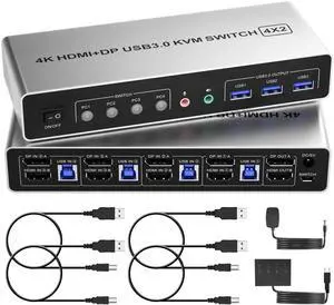 USB 3.0 KVM Switch Displayport+HDMI 2 Monitors 4 Computers, 4K@60Hz Dual Monitor KVM Switch 4 Port with Audio Microphone Output and 3 USB 3.0 Ports, 4 Port HDMI+DP Monitor Switch for 4 PCs 2 Monitors